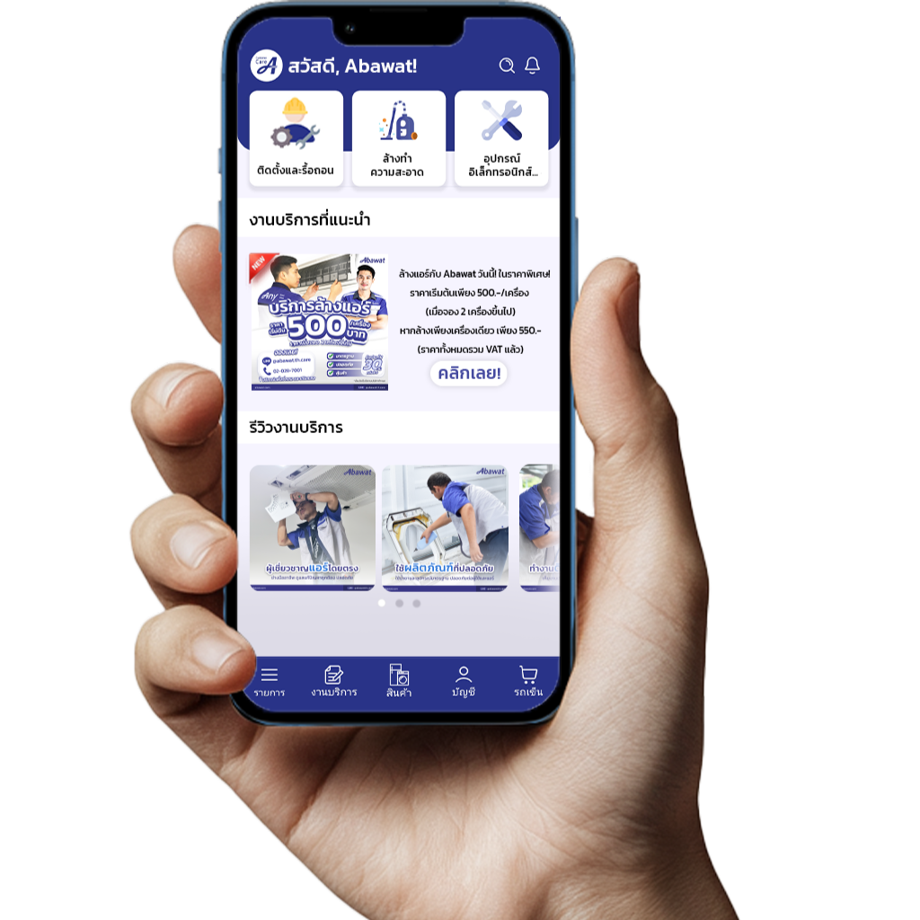 เพราะเครื่องใช้ไฟฟ้าในบ้านคือส่วนหนึ่งของชีวิตประจำวัน และเมื่อถึงเวลาที่ต้องติดตั้ง ล้าง หรือซ่อมแซม Abawat พร้อมดูแลคุณทุกขั้นตอน เรารวมทุกบริการไว้ในที่เดียว ไม่ว่าจะเป็น ติดตั้ง เคลื่อนย้าย ทำความสะอาด ซ่อมแซม และบำรุงรักษา โดยทีมช่างมืออาชีพที่ผ่านการคัดสรรและฝึกอบรมมาอย่างดี เพียงแค่คุณเรียกบริการผ่านแอปหรือเว็บไซต์ของเรา คุณก็สามารถนัดหมายช่าง เลือกเวลาที่สะดวก และได้รับราคาที่ชัดเจนผ่านบนหน้าจอของคุณทันที ไม่มีค่าใช้จ่ายแอบแฝง ทุกงานบริการมีการรับประกัน พร้อมดูแลคุณจนกว่าปัญหาของคุณจบ